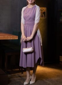 1:挑戦しやすい大人のカラー♪ くすみブルー、くすみパープル系パーティードレス