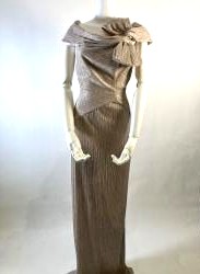 右肩から左腰にかけて渡されたドレープの斜めのラインに洗練されたデザイン性を感じる1着です。